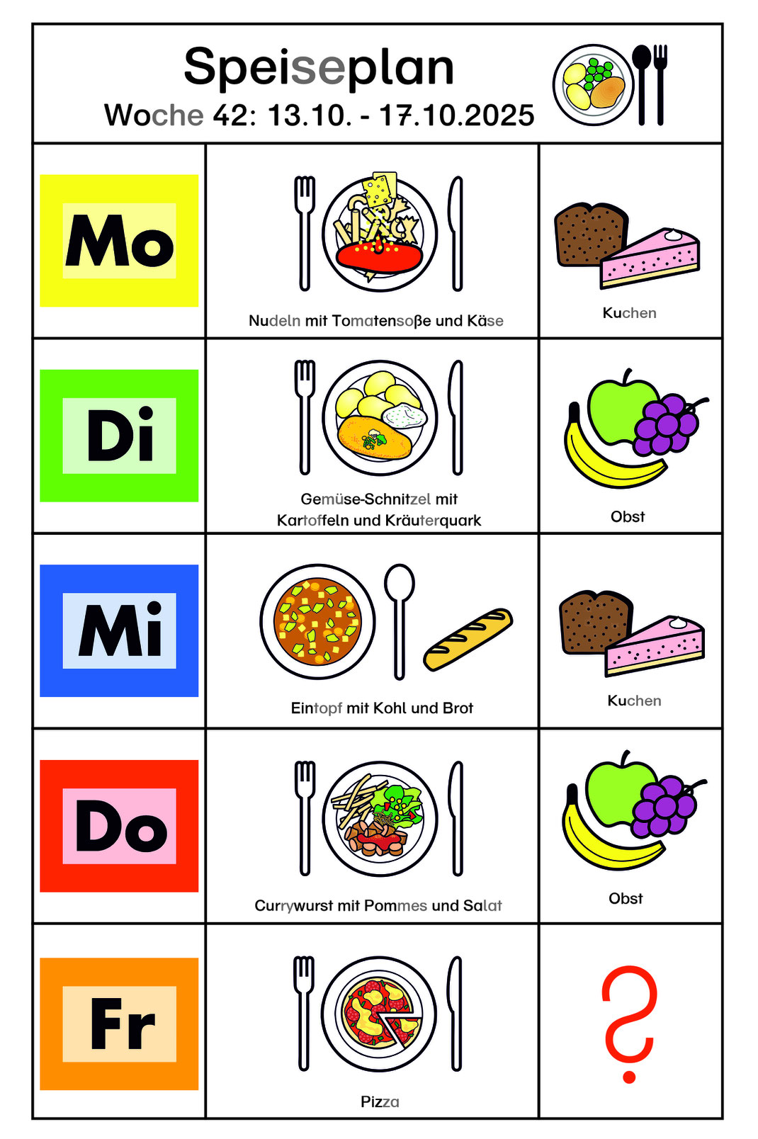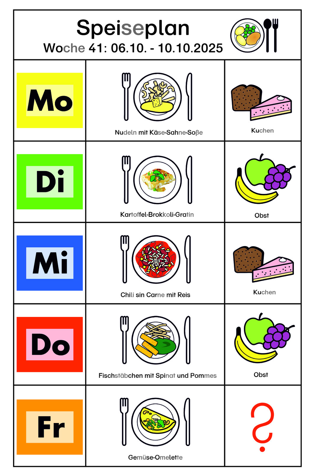 hier sehen Sie die Speiseplan in Bildform, wie er in der Schule ausgehängt wird. Damit Sie einen Überblick bekommen, welche Zusatzstoffe bzw. Allergene möglicherweise enthalten sind, veröffentlichen wir zusätzlich den Speiseplan als pdf-Datei zum Download, den wir von dem Essensanbieter geschickt bekommen.
